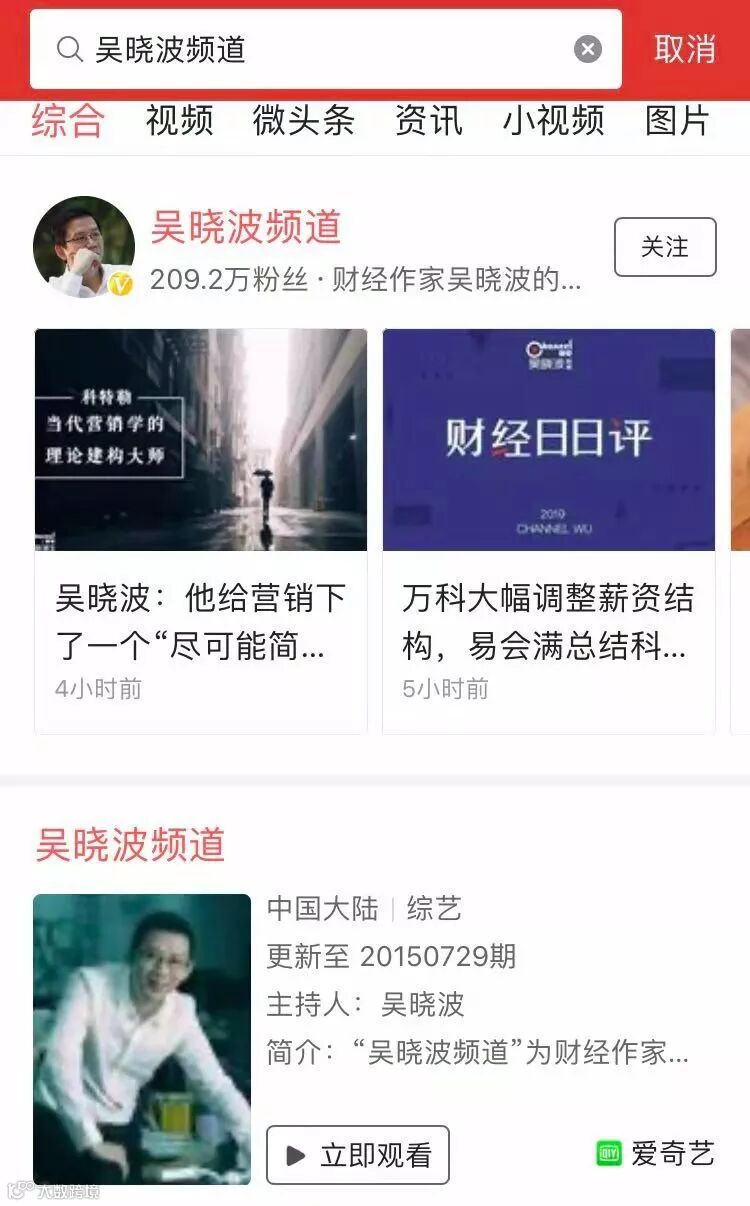 研究全网营销可以参考财经大号「吴晓波频道」,其文章在头条号同步,视频在爱奇艺更新,音频在喜马拉雅FM运营,这些平台上的内容持续为它的微信公众号导流。