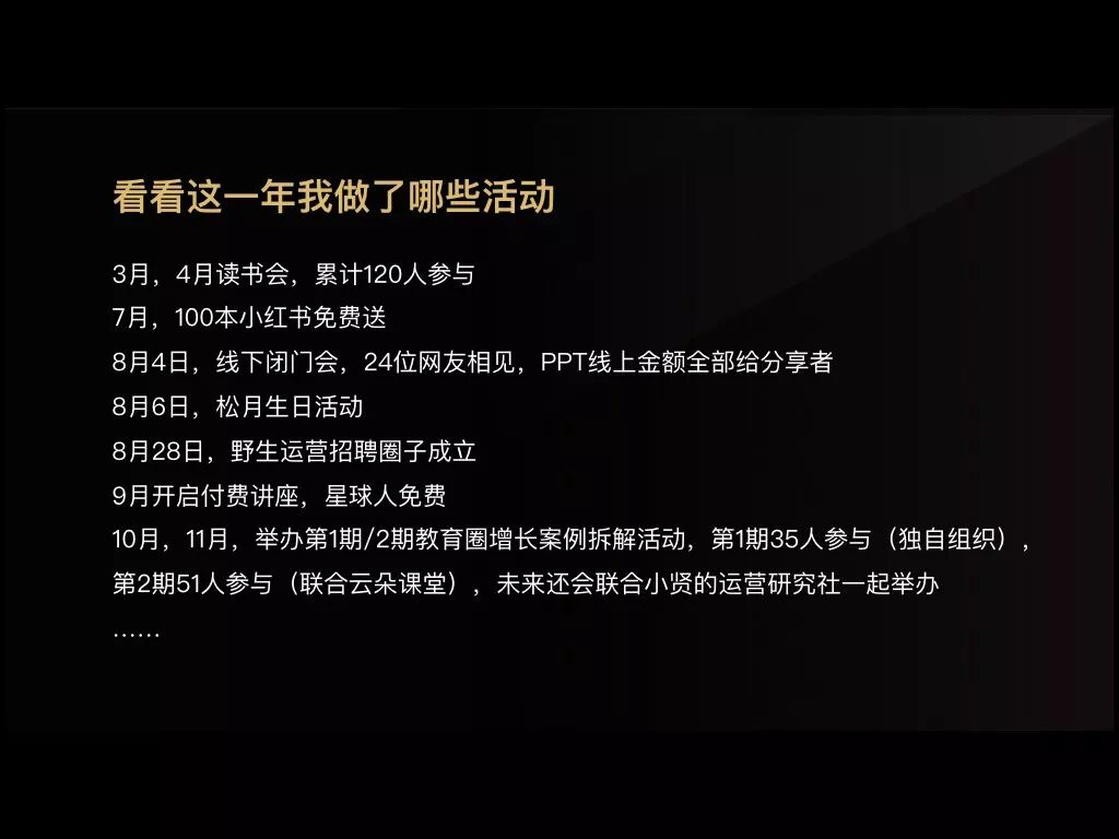 群里的小伙伴告诉我,他之前以为我是全职在做这个社区,当我告诉他,我还在公司上班,他表示很震惊,他跟我说,感觉这个群是有专业团队在打理的,这和他以前加入的群完全不同,无论群的活跃程度,还是讨论话题的优质程度,群生命周期都在他以往进过的群之上,他已经退了很多群,但野生运营群他一直没有退,即使不说话,也能从这个群获得很大的价值。