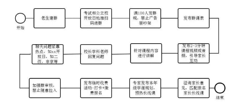 其中,教学服务和班级群运营很难分割开来,因为这是整个低价班的运营流程,而且在落地的过程会发现,低价班到长期班的转化,就是这套完整流程在起作用。