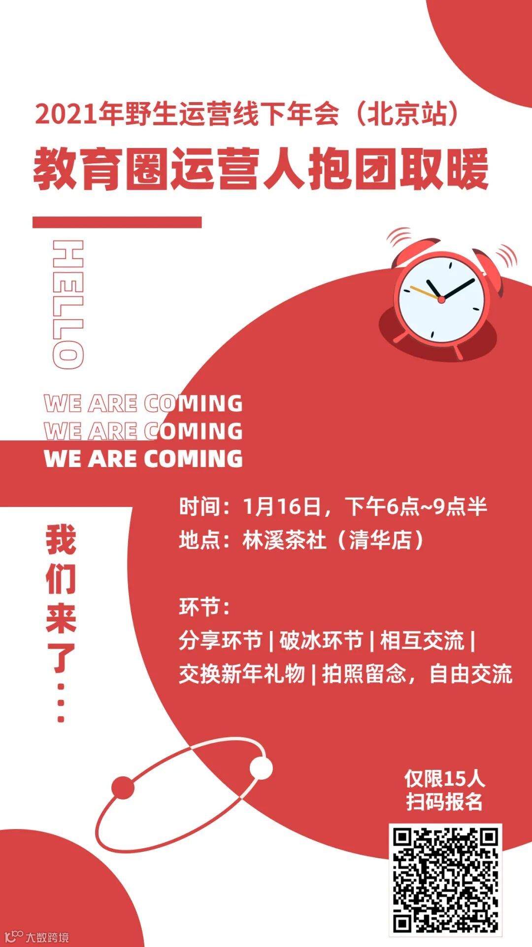 另外“2021年野生运营线下年会の教育圈运营人抱团取暖”其他城市站,如广州、深圳、成都等,如果你是在线教育从业者、且擅长组织、拥有广泛人脉和资源、对野生运营这个组织非常认可,也可以联系微信 songyue-growth,并注明【申请】,可申请以上城市的线下活动组织权。