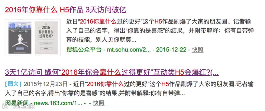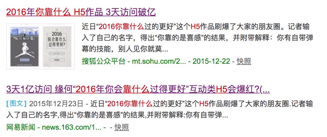 大学后的第一份工作,我去了一家移动互联网公司,从事H5创意和公众号运营工作,1年时间,把公众号粉丝做到130万,并亲手写下30余篇10万+微信文章。当时公众号基于热点和节日做营销策划,我就从创意、文案、画原型图、对接项目组等等一手操办,每个工作流程和细节对个人的成长提出了更高的要求。在公司这几年做了不少爆款H5,其中一个”2016年你靠什么“,实现上线3天1个亿PV,并被网易、搜狐、南方周刊等多家媒体先后报道,并拿下了当年的”最佳移动营销奖“。