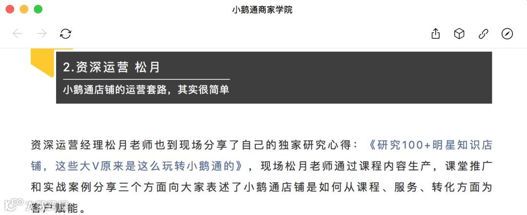 也是在去年,自己有了创业的小想法,和朋友在小鹅通开了一个知识店铺,目标人群是0~3岁的新媒体从业人员,朋友负责商务和市场,我负责课程生产、招生、学员运营等一条龙工作。