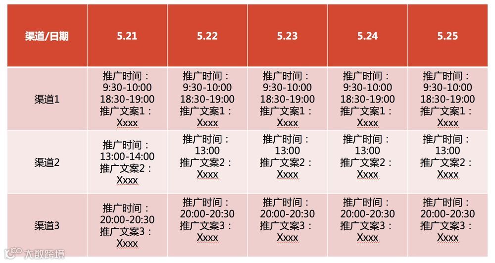 另外,运营推广的人还需要在这个表的基础上增加推广计划的相关信息,比如频次,文案等,根据每天的数据变化,灵活调整各渠道的推广文案、推广周期等。