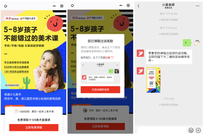 在营销细节上,有到少儿美术首先借助了网易这一品牌,以此降低用户认知(主要是一线人群),其次是落地页背景着重营造学生绘画的视觉感受,色调很有舒适感,最后是引导行动环节,使用较为常见的锚定效用,用免费和129元做对比,促使用户点击报名。