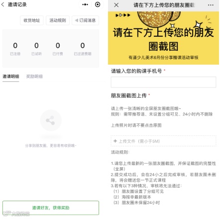 二是设计了转发有礼,借助的是表单工具,用户只需输入手机号并上传分享截图,就可以获得1节赠课,虽然奖励很少,但增加了分享频率,属于常用策略。当然,为了保证分享有效,审核力度也是很大的,“24小时+不分组”是惯常条件,可复用性极强。
