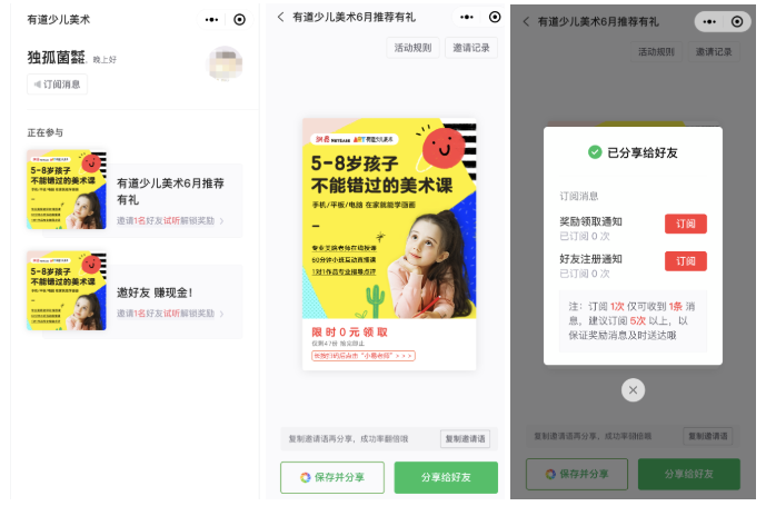 后者是小程序的组件功能,可以大大提升分享效率,但该小程序点击分享后再取消会被认为分享成功,好在会有弹窗提醒要求订阅消息,这在产品层面保证了邀请的有效性。