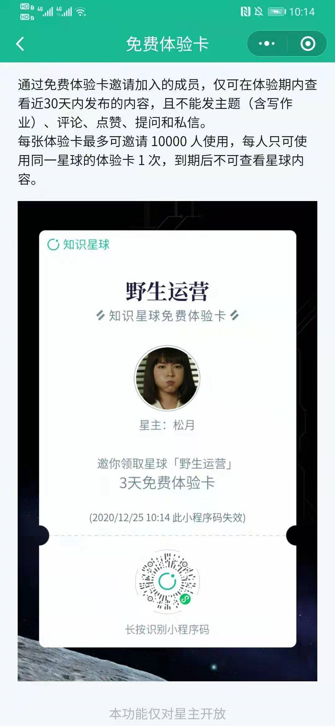 今天是感恩节,一直有小伙伴跟我说,想加入野生运营的知识星球,但不知道星球具体有什么,今天发一波知识星球体验卡,扫码即可领取(领取和使用规则如图):
