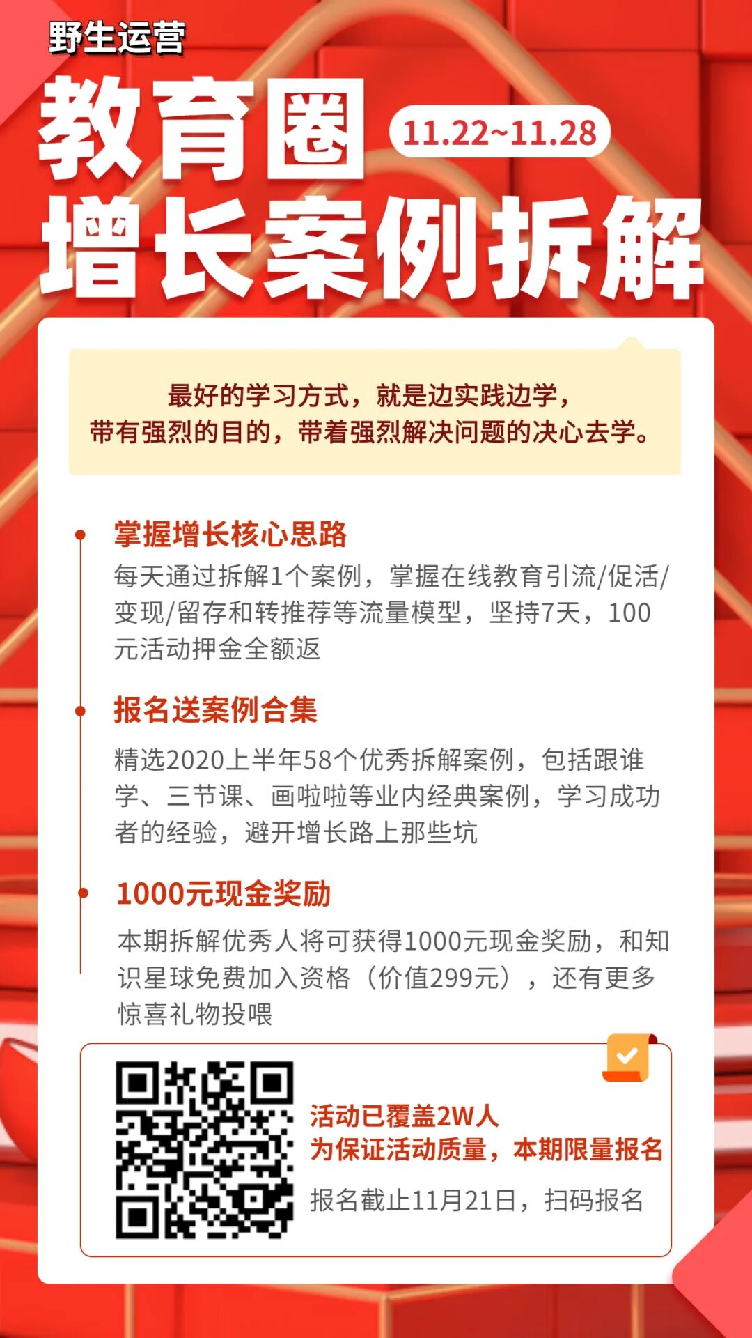 看了野生运营那么多案例拆解,只有自己动手拆解才能深入体验,并且通过不断的练习-实操-复盘,才能提升运营技能。强烈建议你报名第 13 期教育圈案例拆解活动,为保证活动体验,本期依然限量报名: