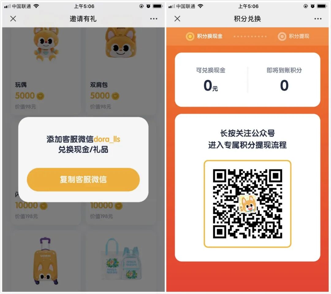 积分兑换流程:点击兑换现金/兑换礼品-关注公众号/加客服微信号-公众号栏目兑换/客服微信号指引去公众号兑换