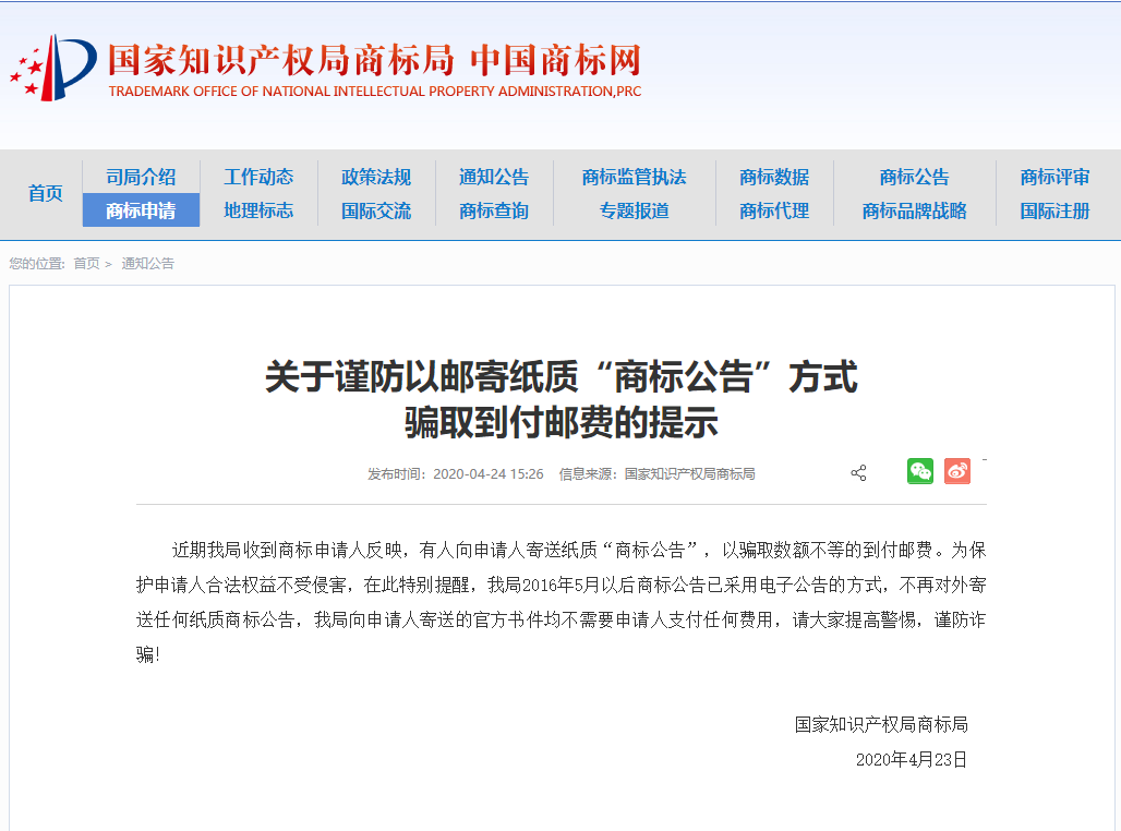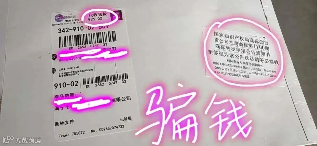 商标初审后,不良代理公司冒充商标局寄《国家知识产权局商标初审公告通知书》的到付费邮件给商标注册人,以快递公司代收邮费的形式骗钱。