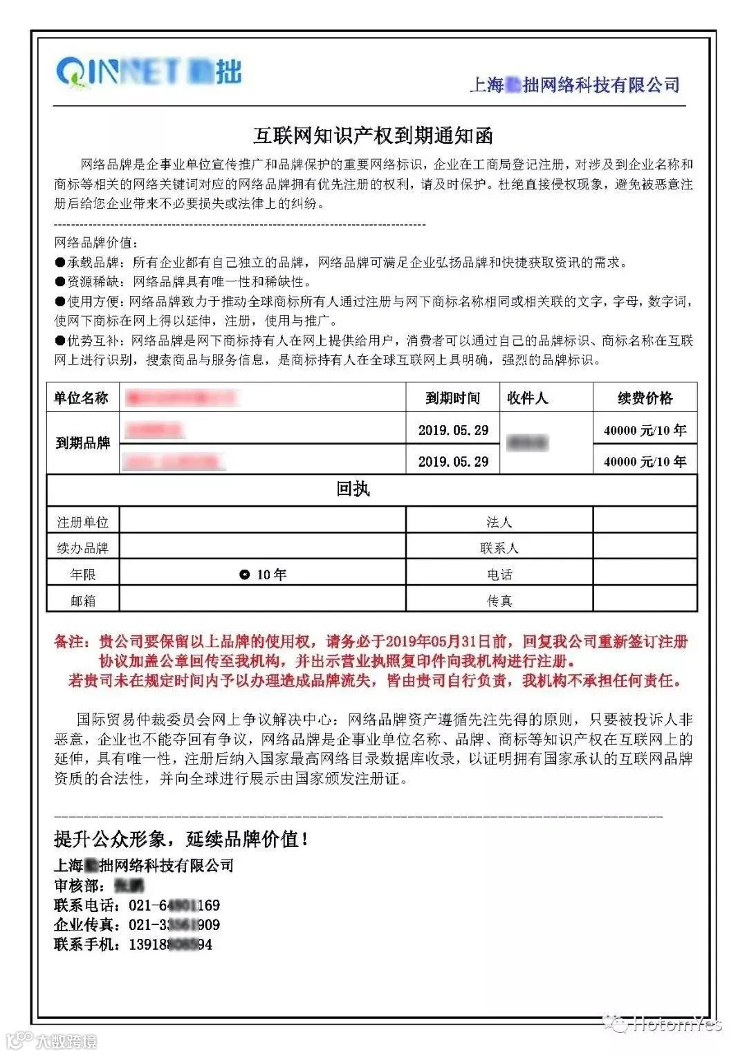骗局三:提前通知续展骗取高额续展费用