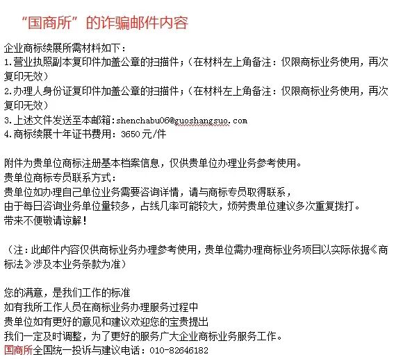 业内臭名昭著的“国商所”,全称“国商商标事务所有限公司”,注册地在西安,谎称是国家局审查五处,商标续展提前两年半就收费(商标续展必须在到期前的一年内办理,提前办理国家知识产权局不受理的),国商所续展收费3650元一件(市场价1000元左右),只管骗钱,从不办事,“国商所”在商标局官网多次被投诉。