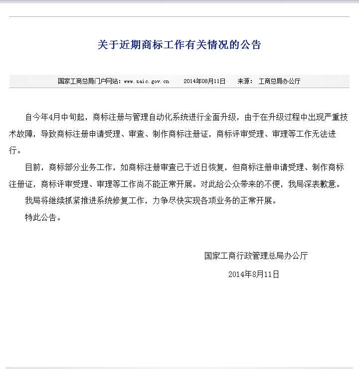 关于近期商标工作有关情况的公告