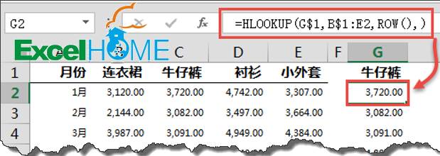 =HLOOKUP(G$1,B$1:E2,ROW(),)