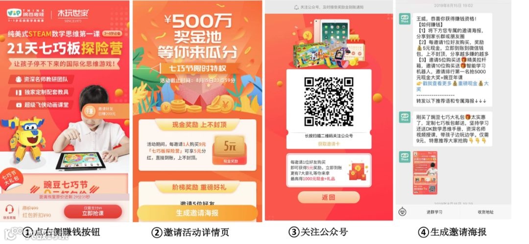 不同渠道来源的用户群的兴奋点会有所差异,活动的基础量是什么样的特性,就需要定向的去刺激这部分信任最强的用户更多去参与分享。这次活动的种子量来源于都是听过豌豆课程的高价课和低价课用户,对豌豆的品牌感知非常强,课程认可度非常高,因此有针对性的出了课程诱饵的策略。