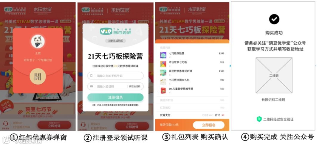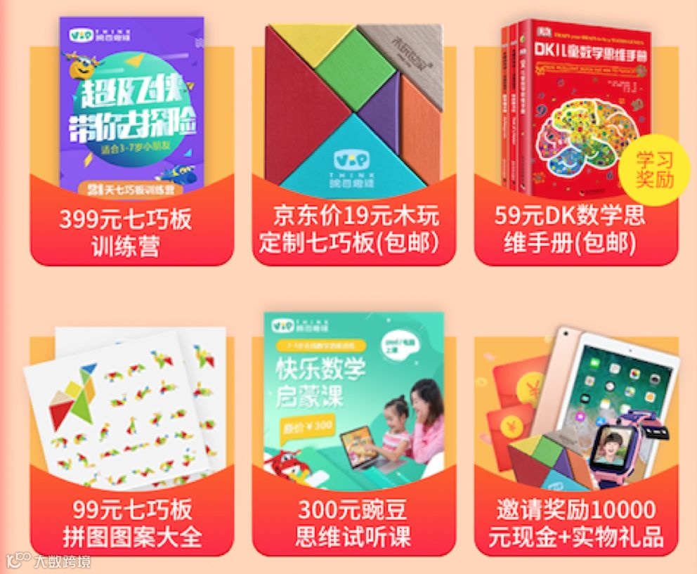 包装的大礼包中,包含21天的七巧板课程、七巧板实物包邮、七巧板拼图大全、豌豆思维直播课、打卡还奖DK数学思维手册。这么便宜的的价格能买到很多东西,每个东西单拎出来都能值9元,而课程一共才9元,每件商品一个个展开放,用户就会觉得非常超值,错过不买都觉得很亏,超预期的价值感知带来超高的转化率。