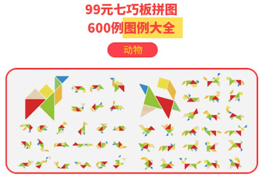 用户所需要的就是市场机会,七巧板加上课程、加上拼图,才能达到立体学习的效果。加入了“600例拼图团案大全”的诱饵,用户很想要图例,600个看着也多,价值感就出来了。
