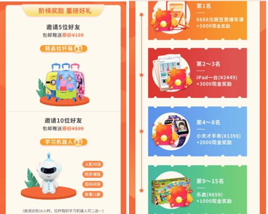 通过设定阶梯奖励,让用户达到更高的目标,邀请5个购买送拉杆箱,邀请10个购买送机器人,提高每个用户的拉新量。排行榜奖励刺激邀请能力很强的用户,刺激他们冲榜,最大限度的邀请身边所有目标用户。