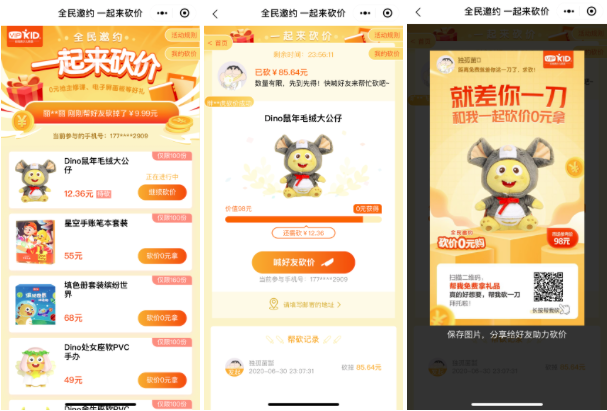从路径上来说,这是一个在公众号裂变基础上升级而来的老带新策略,兼顾了张粉和注册两个目的,其中有一个小亮点,在公众号与小程序之间的衔接引导上,直接告诉用户“成功帮好友砍xx元”,保证了基础转化率。