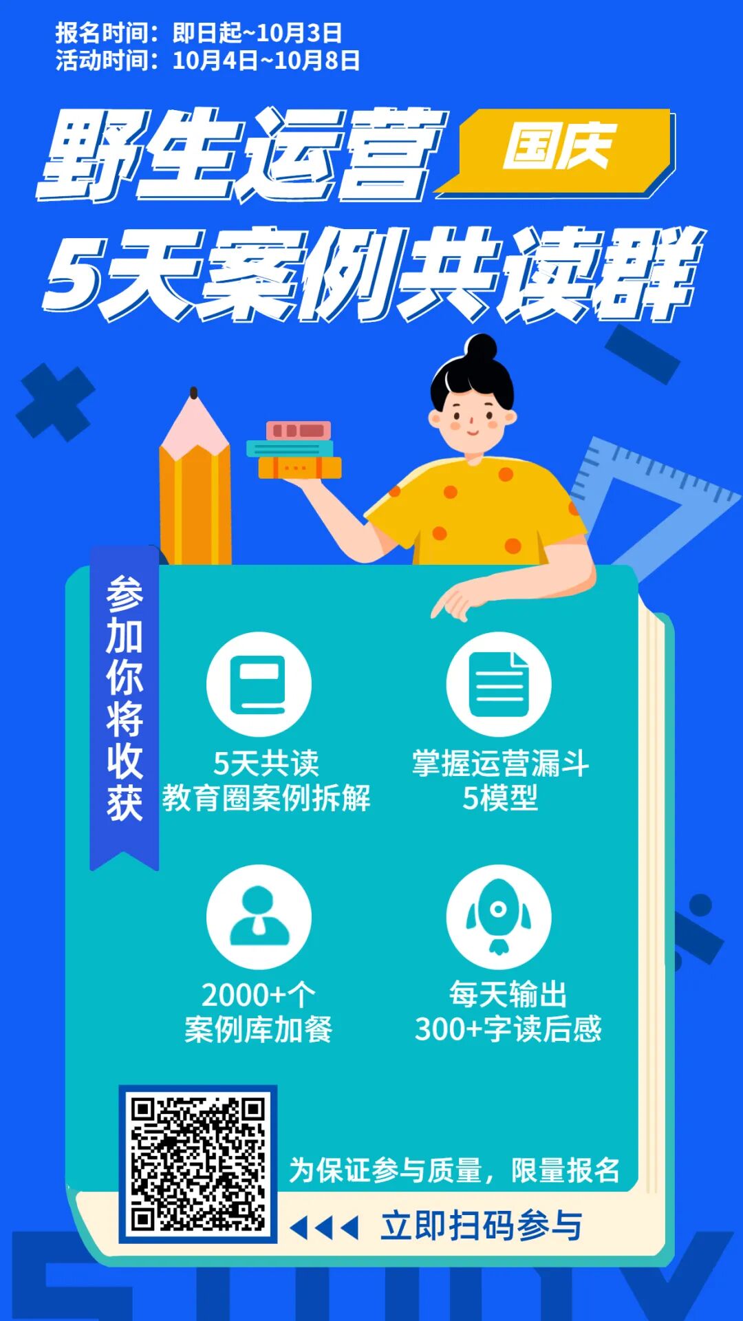 今年国庆,携程预计会有 6 亿人出门,不打算出门凑热闹的小伙伴,强烈建议你报名野生运营组织的『国庆读案例活动』,每天20分钟,兼顾学习和休息,利用小长假进行弯道超车再好不过,名额不多,扫码了解活动详情及报名↓↓↓