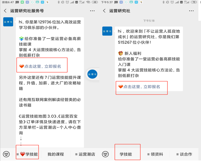 1.“运营研究社”订阅号、服务号关注自动回复超链接