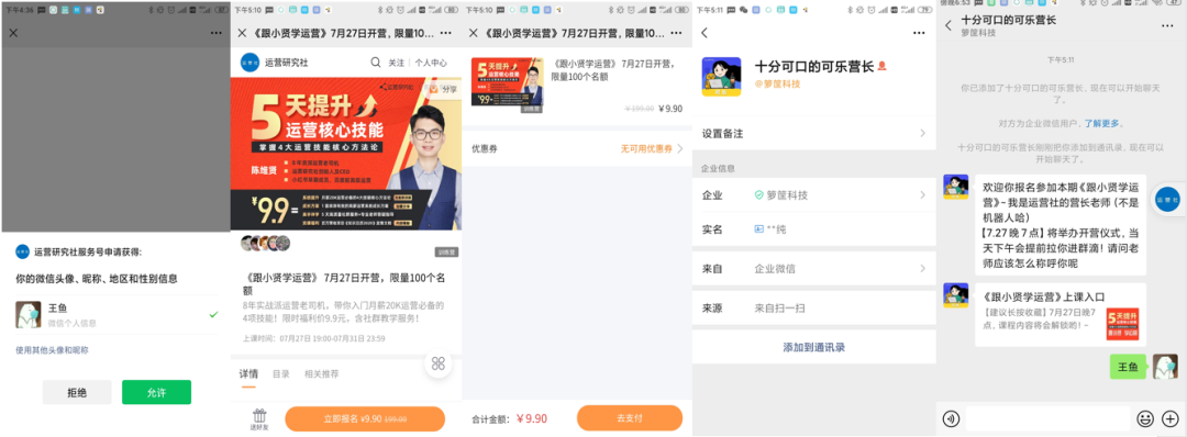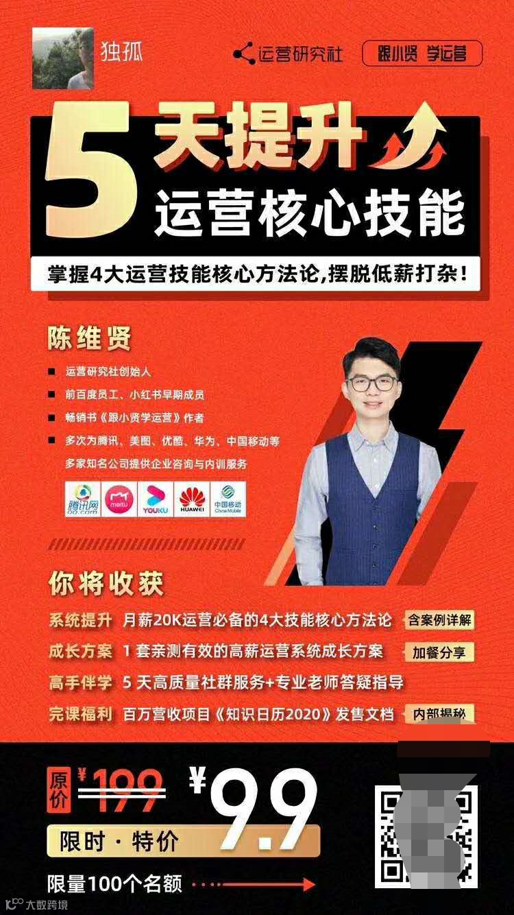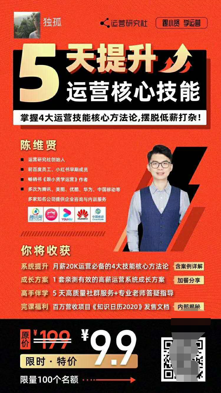 这个是“运营研究社”的一个出品的0-2岁运营人9.9元的低价向高价的转化训练营课程,是一个长期存在的低价课程。课程包括4天精华课程+5天的社群服务+营长督学指导+百元其他福利。由运营研究社创始人小贤老师亲自授课,主打运营核心技能的提升。