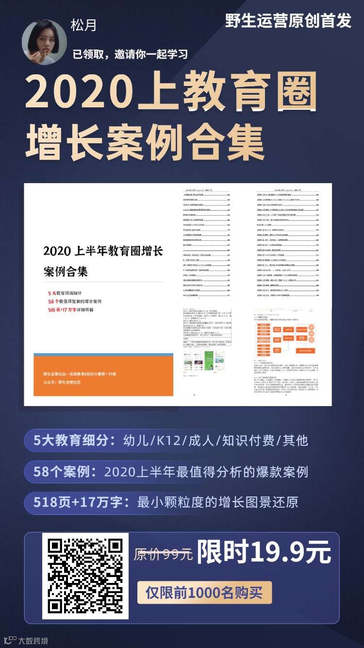 野生运营首发,《2020上半年教育圈增长案例合集》正式发布,集合 5 大领域、58 个爆款案例,共计 518 页,17.5 万字,最小颗粒度进行拆解,真正做到看完可复用。