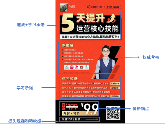 下面按照海报的六要素对海报文案进行拆解。限量100名额让用户同时有损失规避和稀缺感,从而引导用户快速下单。突出权威性,陈维贤作为运营研究社的创始人背书。承诺将会学习到:5天提升运营4大核心技能、个人成长方案、高手伴学和课程福利。