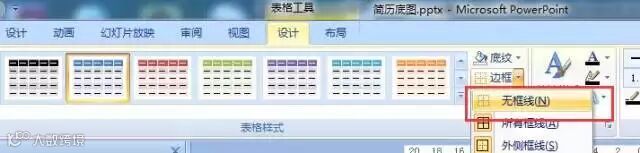 填写完成后,在表格边缘双击鼠标左键,在工具栏“表格工具”中选择“边框”-“无框线“即可。如图: