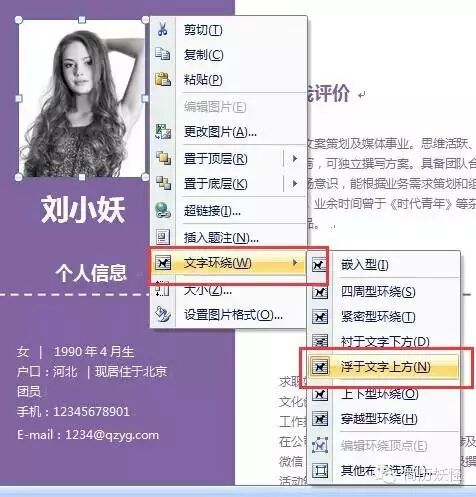 方法一:在照片上单击鼠标右键,选择“文字环绕”选项,选择“浮于文字上方”。