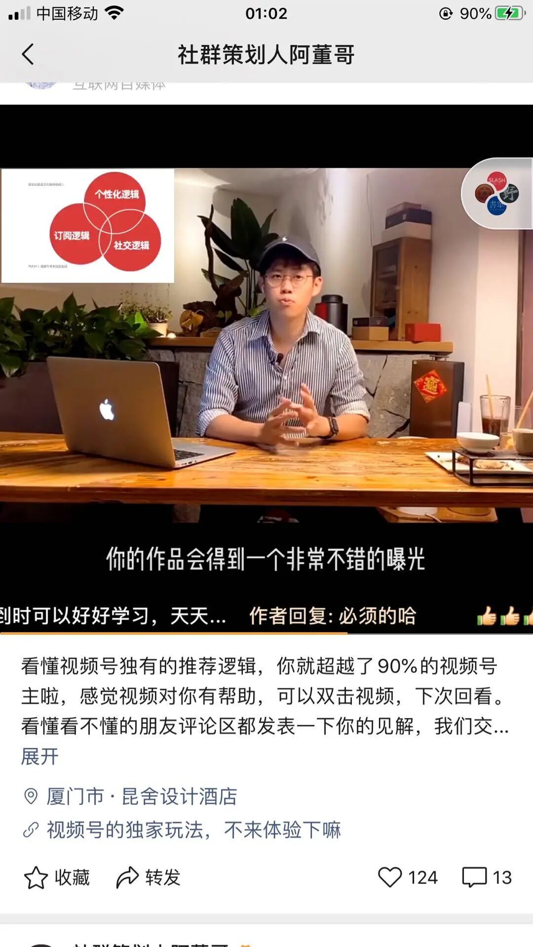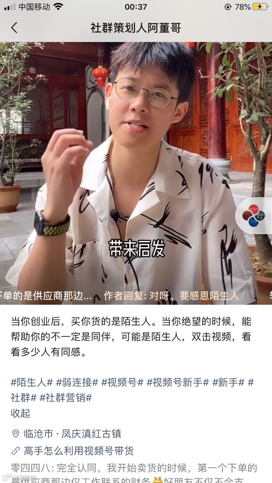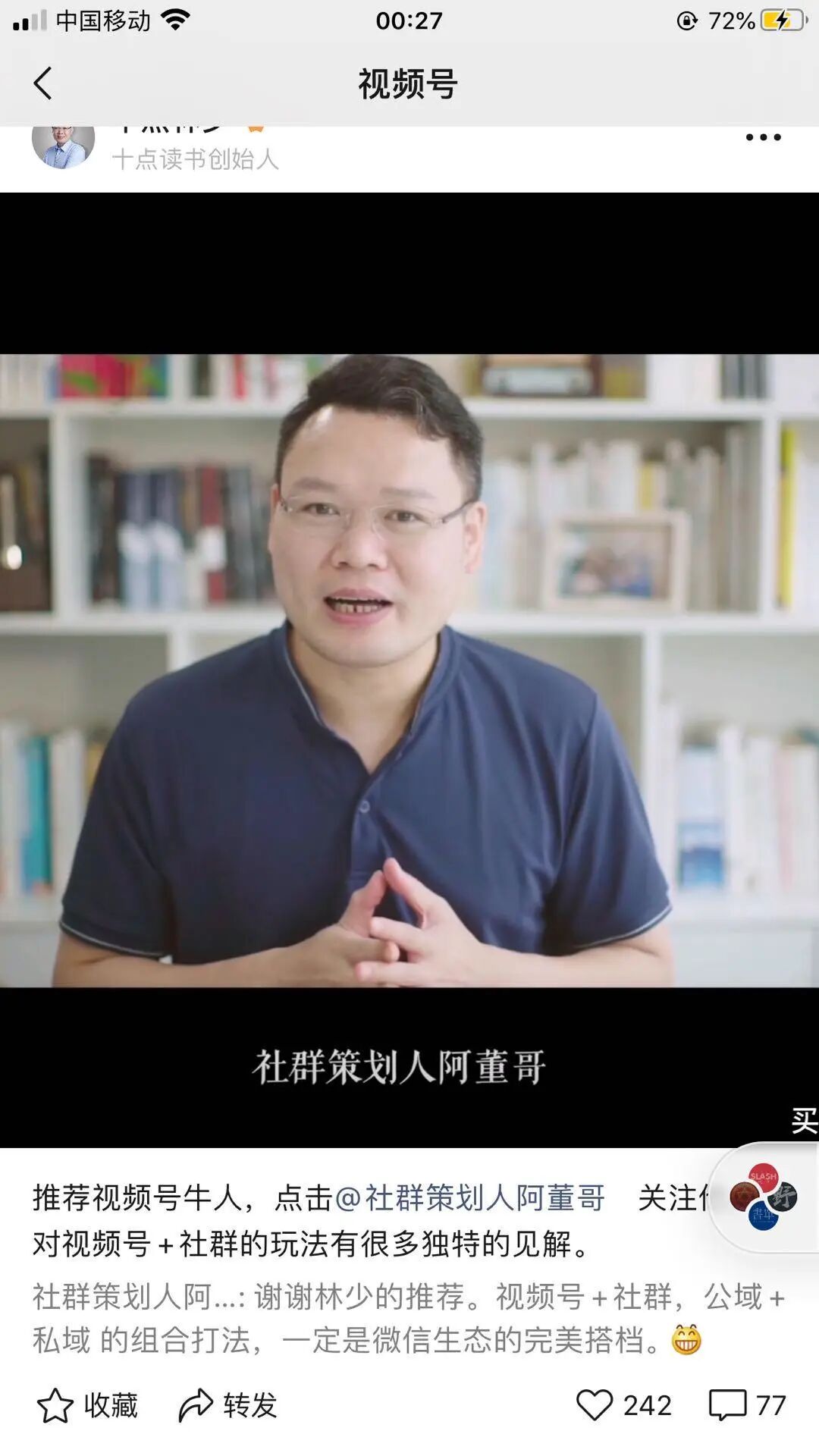 十点读书创始人林少就主动发了一条视频推荐他,从评论区看也是一片好评, 增强未关注用户的信任度,再看内容,想要学好视频号的人可能就直接关注了。