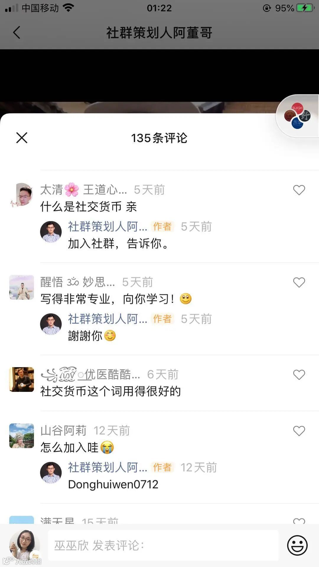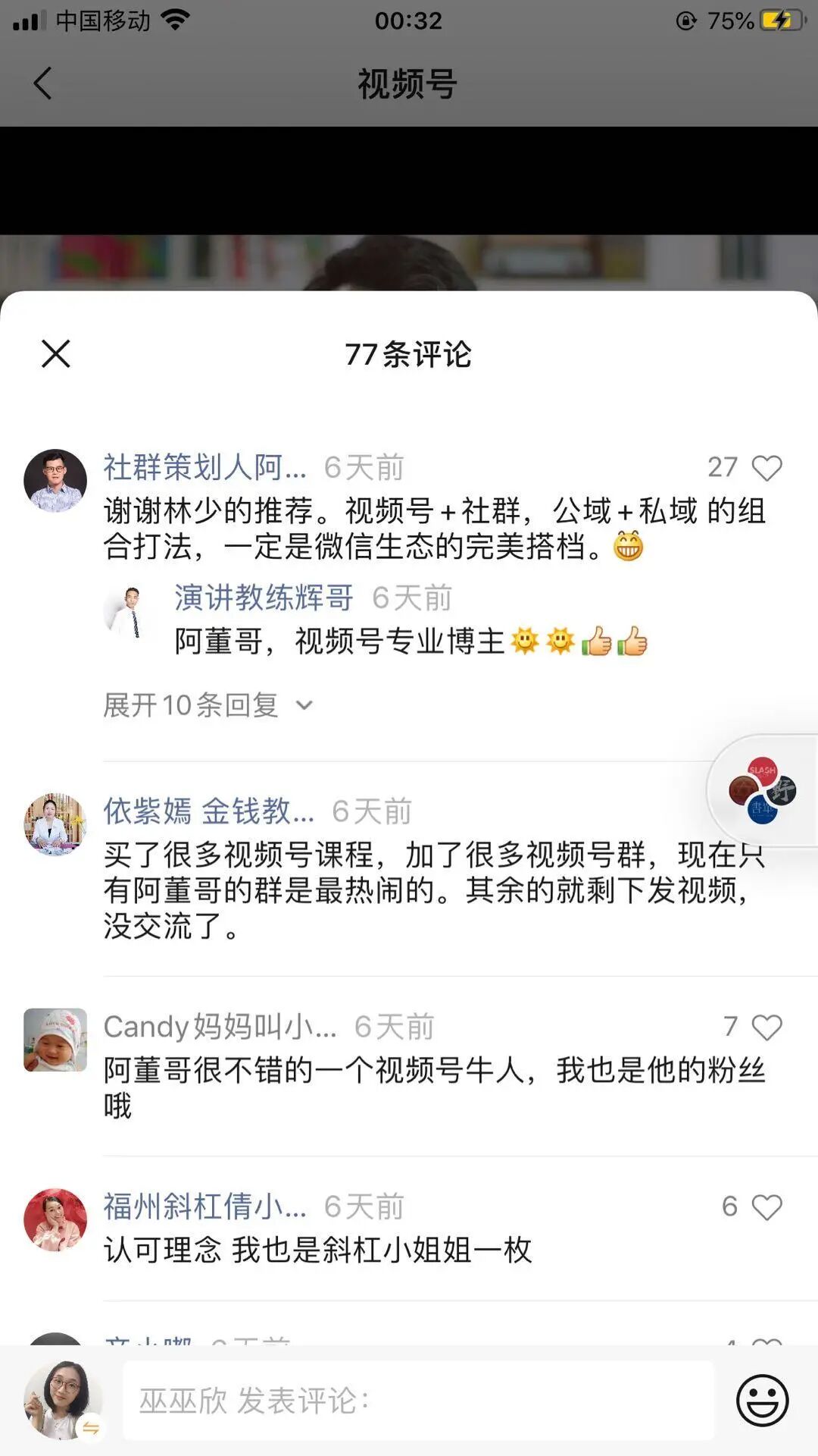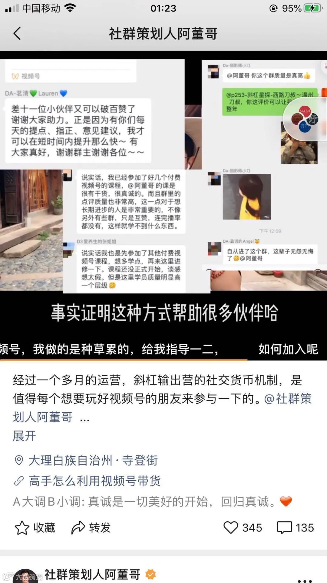 阿董哥自己也分享说:“每当我发完视频号作品后,第一时间会发到我们的视频号输出营里,邀请成员来互评,我的很多视频的排行前三的评论都是我们社群成员写的。”