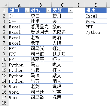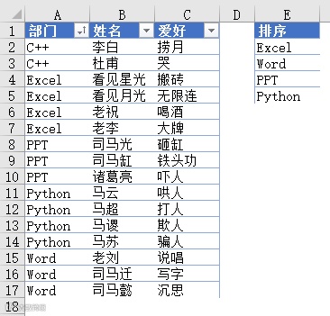 现需要根据E列所指定的部门先后顺序,对数据源进行重新排序,如果部门不在指定序列内,则排放在数据源末尾。