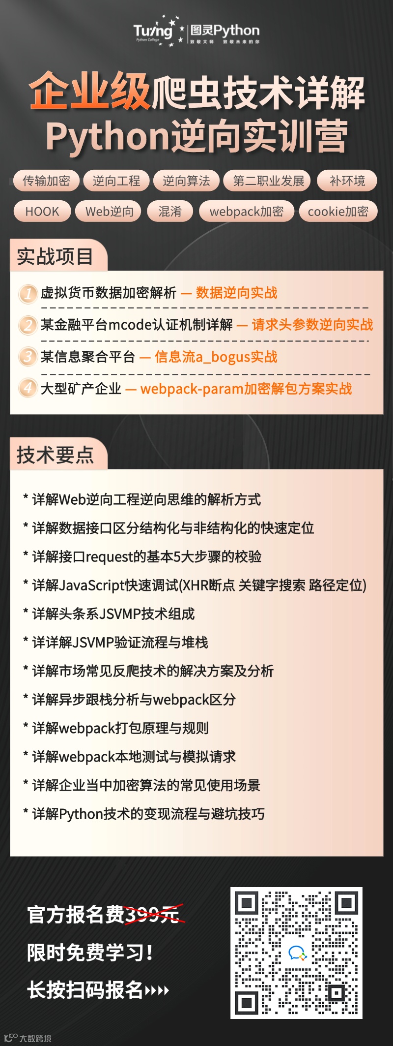 这是一套专讲爬虫与反爬虫攻防的实战特训课程,本次将由国际大数据竞赛获奖大佬讲解,带大家进行一线前沿技术体系+多重逆向解析项目实战的综合技术速成训练!