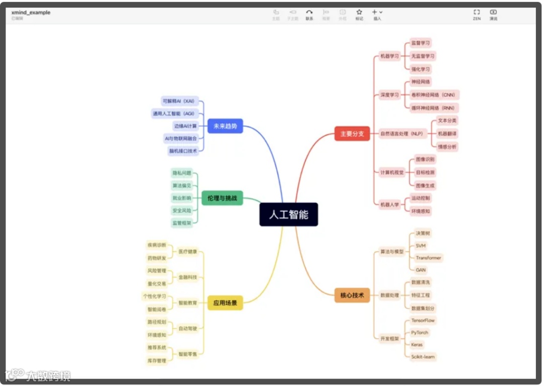 我们可以根据需要进行进一步的编辑和美化,这样我们就完成了用DeepSeek + Xmind一键生成思维导图。