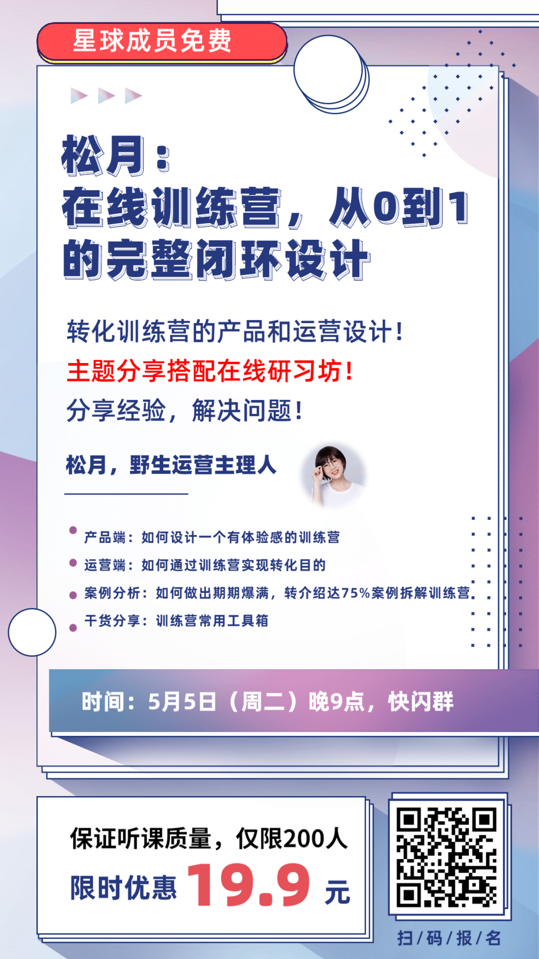 《在线训练营,从0到1的完整闭环设计》这个主题!为了保证听课质量,本次分享限量报名,报名截止5月5日(今晚)18点,过期报名不拉群,扫描下方海报报名。