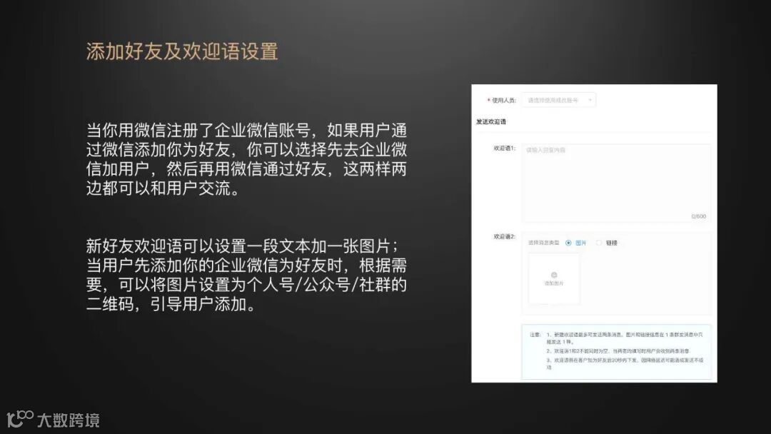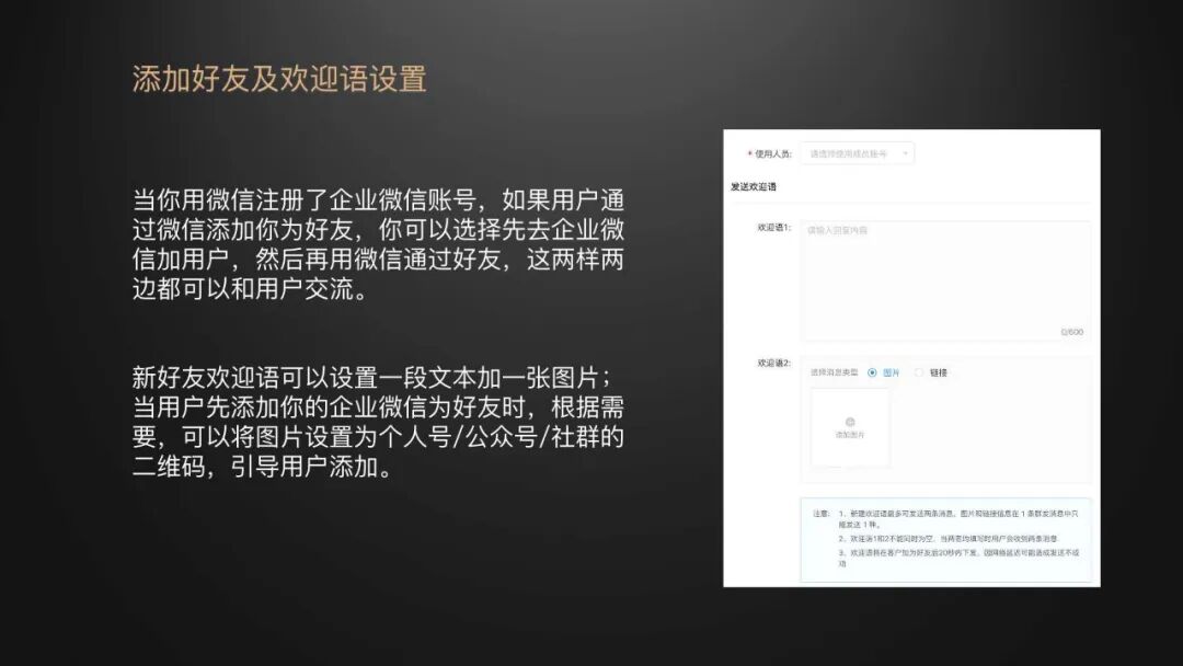 然后新好友欢迎语,是可以设置一段文本加一张图,或者说一个链接的。当用户先加你的企业微信为好友的时候,你可以根据自己的需要,再把它导流到你的个人号、或者说公众号或者说特定的一个社群里面。