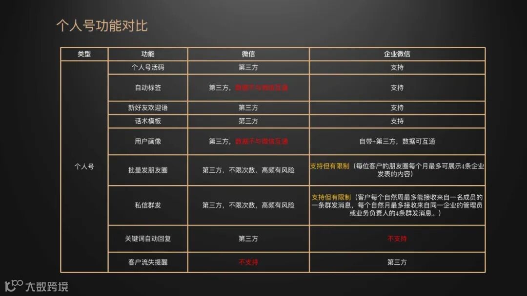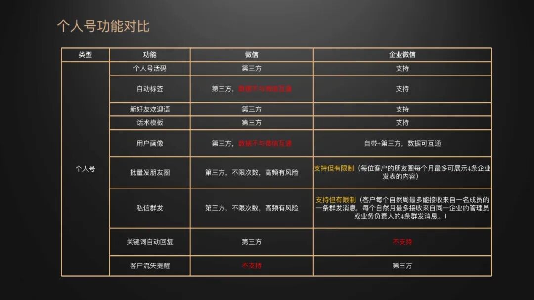 这里先带大家来对比,看一下个人号运营的一些功能对比。大家可以看到这个标红字的就是表明不支持的功能,黄字的呢,是表示功能支持,但是有一定的限制。就当前的这个功能对比来看,企业微信唯一不支持的就是。跟客户私聊的时候,关键词自动回复。这可能和企业微信倡导的人性服务有关,希望提供有温度的真人服务,而不是机械化的这种自动应答。但是关键词自动回复这个功能在企业客户群里面是有的。