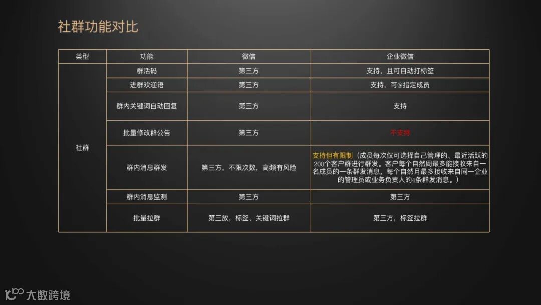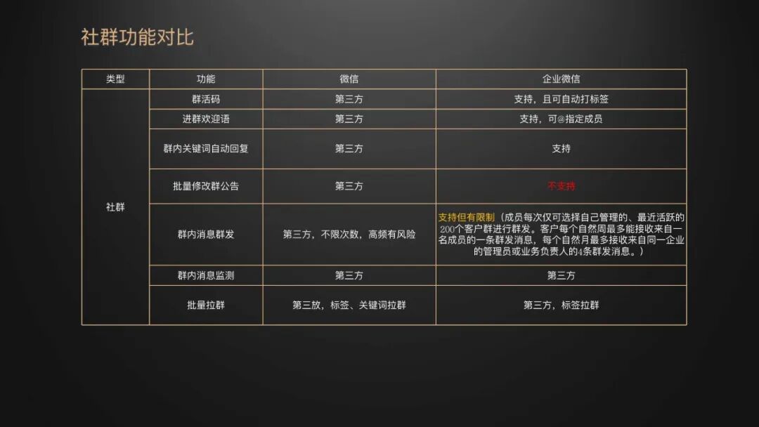 接下来我们来看一下群功能的对比,因为时间关系,这个我就不带着大家一条一条的过啦,大家可以结束之后,自己再详细看一下、然后。目前企业微信群,不支持批量修改群公告,这个我觉得以后如果放开的话,他也会限制修改的频率。因为毕竟你批量修改一次,就相当于是一次群发。