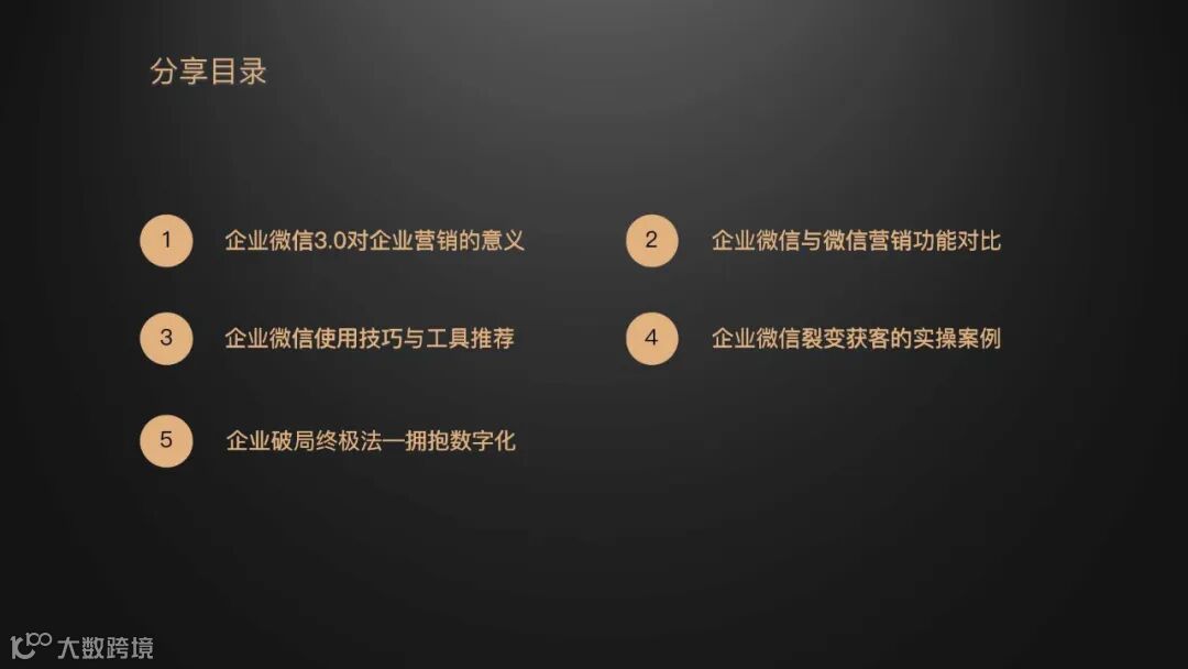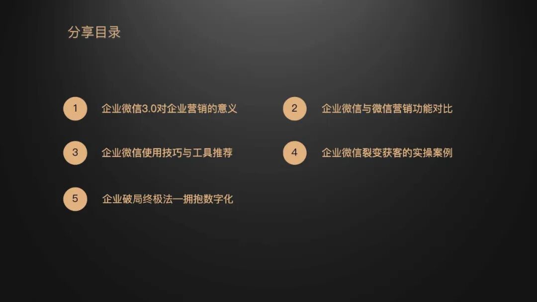 今天给大家分享的内容主要包含五个部分,第一部分是企业微信3.0对企业营销的意义。第二部分是企业微信与微信营销功能的对比,第三个是企业微信使用的技巧和工具推荐,第四部分是企业微信裂变获客的实操案例。第五部分是企业破局,如何拥抱数字化。