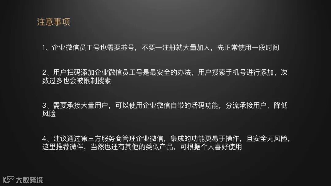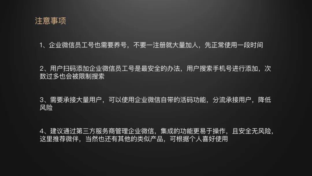 这里我列了几个注意事项,大家可以参考一下。首先,企业微信员工好也是需要养号的,你不能。一注册,然后就大批量的去加人,或者说让别人加你,你先正常使用一段时间,它这个也是要考核你这个。聊天的活跃度的。如果说你注册完了之后,就是用来加人,这就是个工具好。这个社会很容易被限制的。