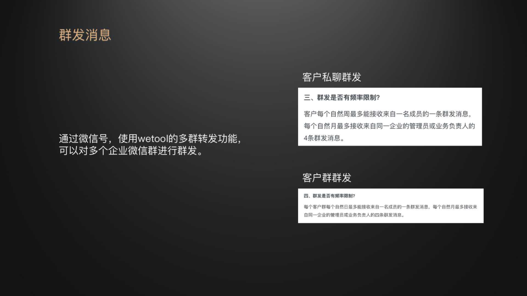 我前面有跟大家提到这个,就是群发消息。大家可以看到这两个截图,就是不管是客户一对一,还是在客户群里面去群发,基本上每个用户接受的上限就是一个月四次。你发的再多,后面他都收不到了。然后怎么去打破这个限制呢?