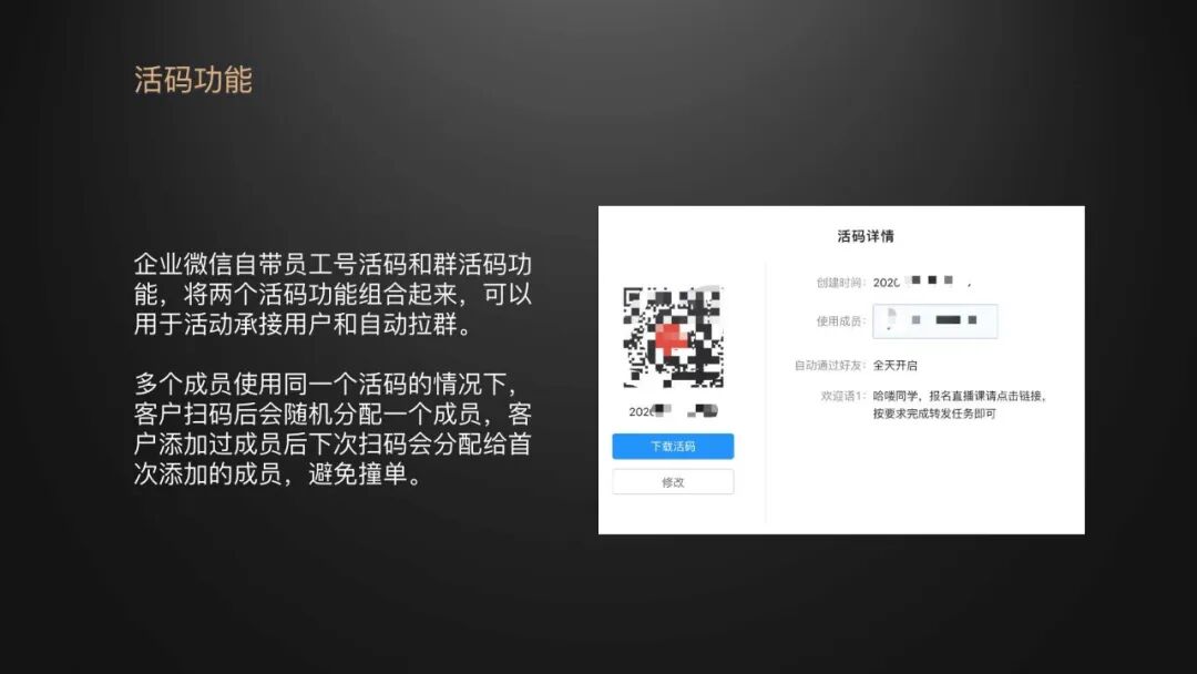 第二点就是这个活码功能,我给大家讲一下,就是企业微信自带这个客服号的活码,还有群的活码,你将这两个功能组合起来用的话,是可以用于活动承接用户,还有进行一个自动拉群的操作的。多个成员使用同一个活码的情况下,就比如说我一个活码面包含了有五个客服号,当客户去扫码的时候,会随机先分配一个客服给他。那如果这个客户他已经添加过一个客服的话,他再去扫这个码。还是会分配到之前已经添加过的那个客服上面。这样的话,在销售上来讲的话,就可以避免撞单。