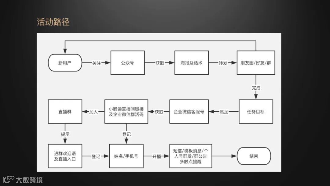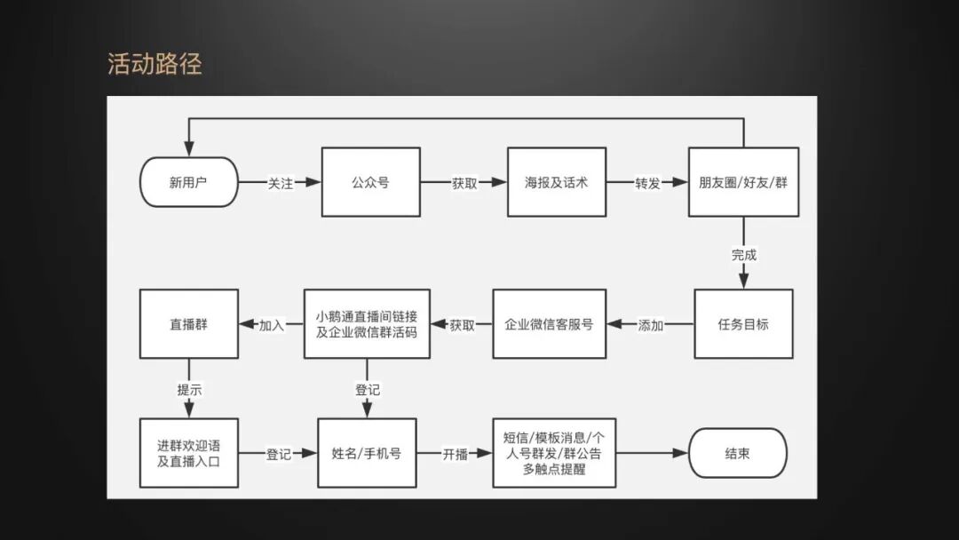 接下来给大家讲一下这个路径,经常做活动的同学应该有画过类似的路径图。前面呢,从新用户到关注公众号,然后获取海报话术转发朋友圈,这个都是比较常规的操作。一直到他完成任务,你通过模板消息或者说是客服消息的形式给到他,这个奖励的一个入口。