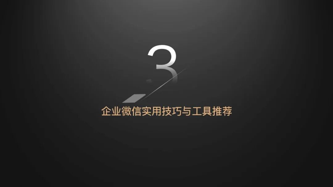 接下来,第三部分跟大家来讲一下企业微信使用技巧和工具推荐,我会重点挑几个,比较有意思的点,跟大家讲一下,因为所有的功能跟大家讲完的话,今天时间可能都不够,所以我挑几个,比较有意思点。
