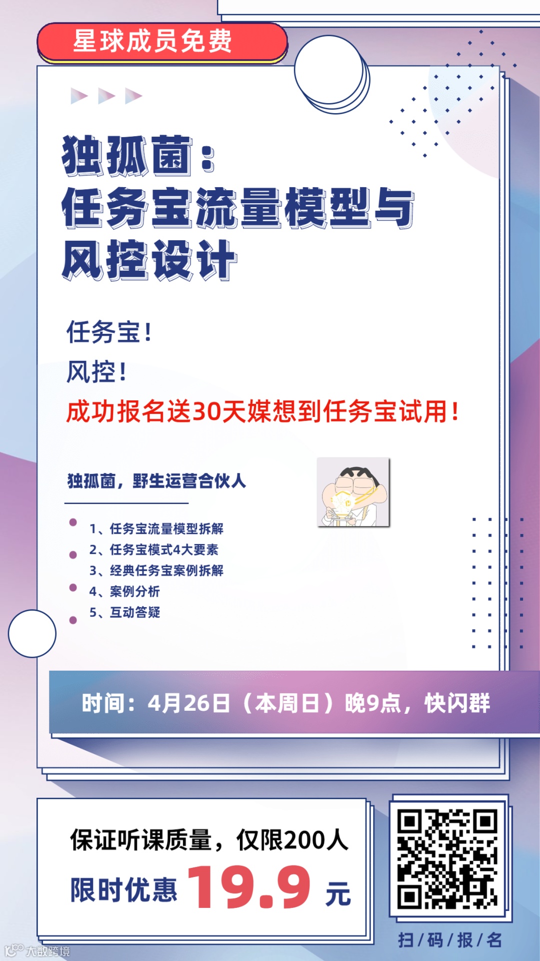 每周一次的野生运营快闪分享来啦,独孤菌专场《任务宝流量模型与风控设计》,报名截止到明晚(4月26日)18点,扫码报名↓↓↓