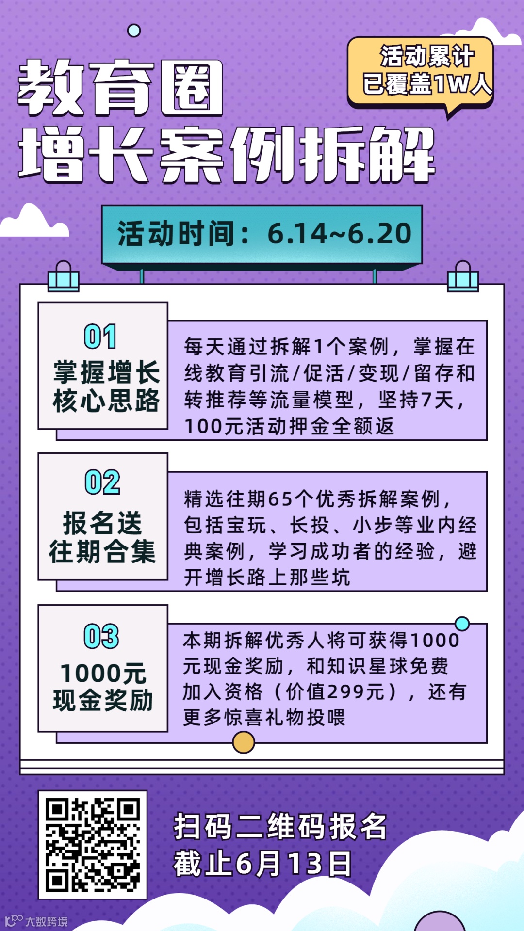 活动时间6.14~6.20,7天时间每天需完成1个教育圈(仅限在线教育和知识付费领域)增长案例拆解和自测题,活动结束后100元押金全额返还(最好自己找案例更有针对性,同时我们也提供案例库)