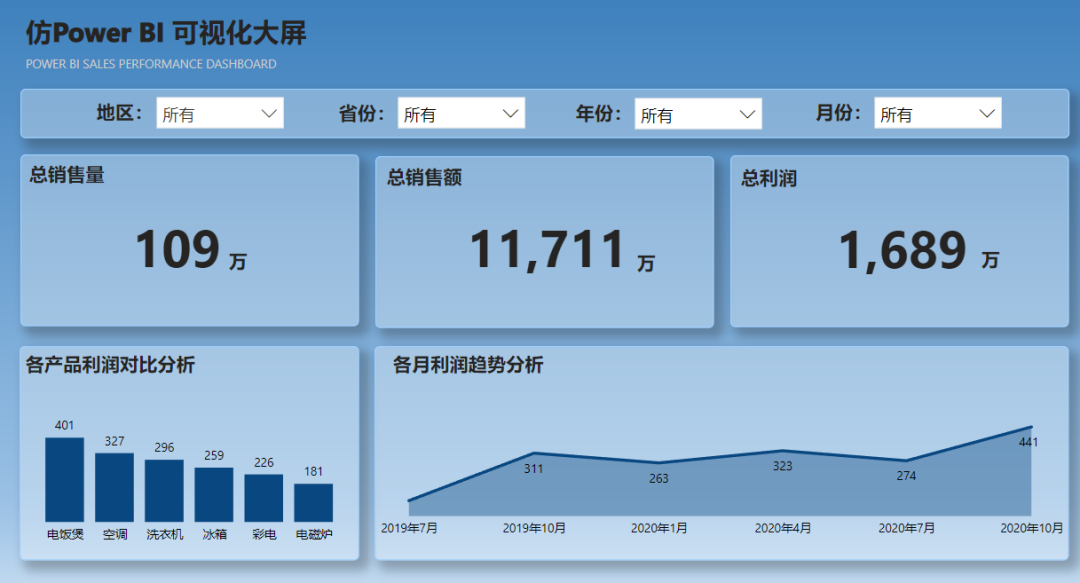 接下来就是向不同的圆角矩形位置,放置对应的视觉对象。其中总销售量、总销售额、总利润三者插入卡片图即可,而各产品利润情况和各月利润情况分析则使用堆积柱形图与堆积面积图更合适。