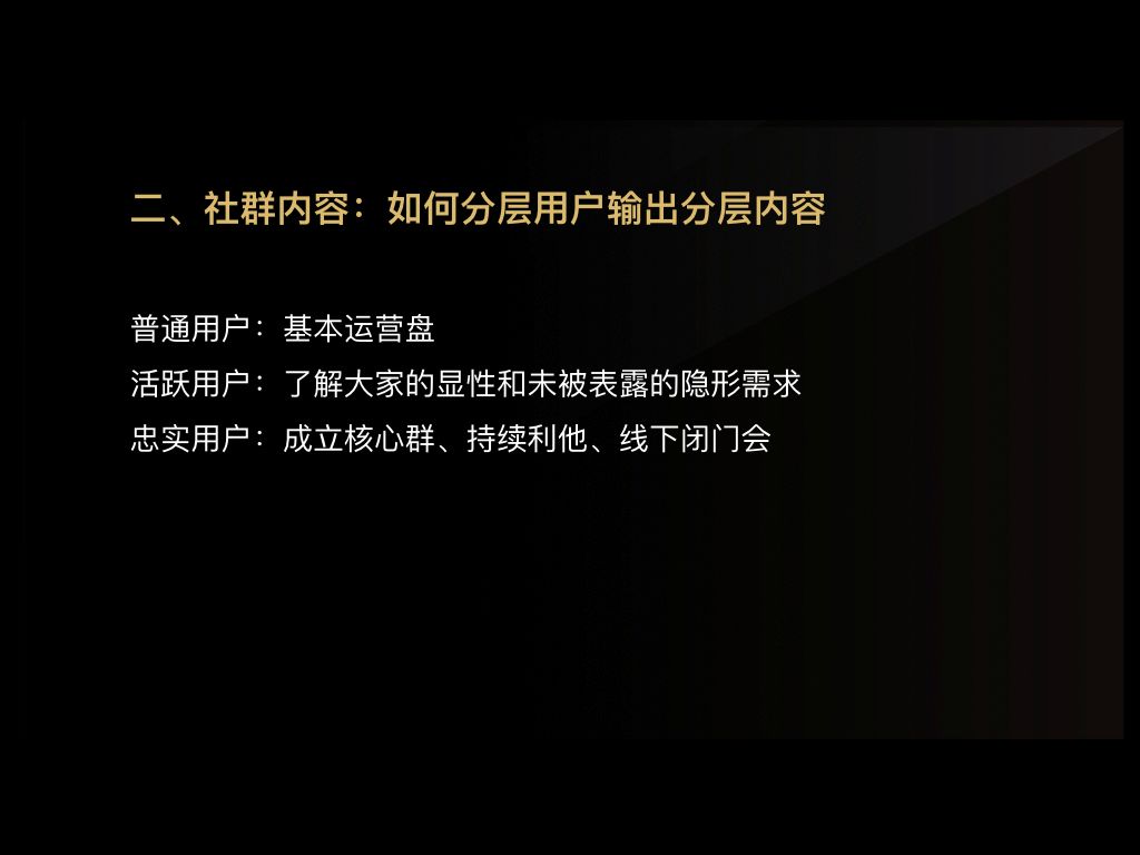 根据群主与用户的关系、用户活跃频次还有用户的属性(比如他究竟是初级/高阶/顶尖运营人),我们可以把社群中的用户分为普通用户、活跃用户和忠实用户三种,每种用户因为自己的属性还有和社群的亲疏关系,其所需要的内容是不一样的。下面我一个个来说,在我的基本盘里,我对普通用户、活跃用户、忠实用户,我分别提供了哪些内容价值。