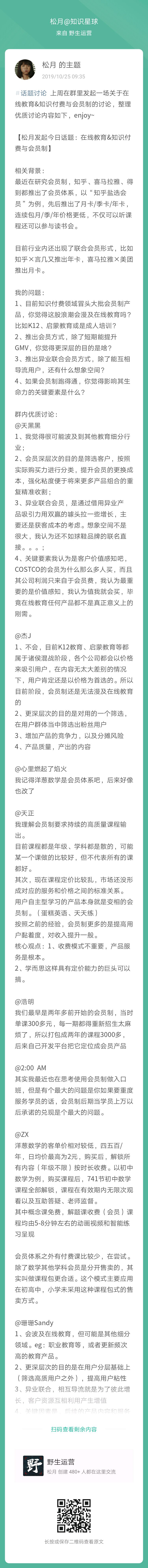 遇到平地炸雷或者是群友问题求助,我会在群里发起话题并先输出自己的观点,群里的每个朋友贡献一点点思考和输出,就是一个很好的内容合集,比如上次讨论的会员制话题: